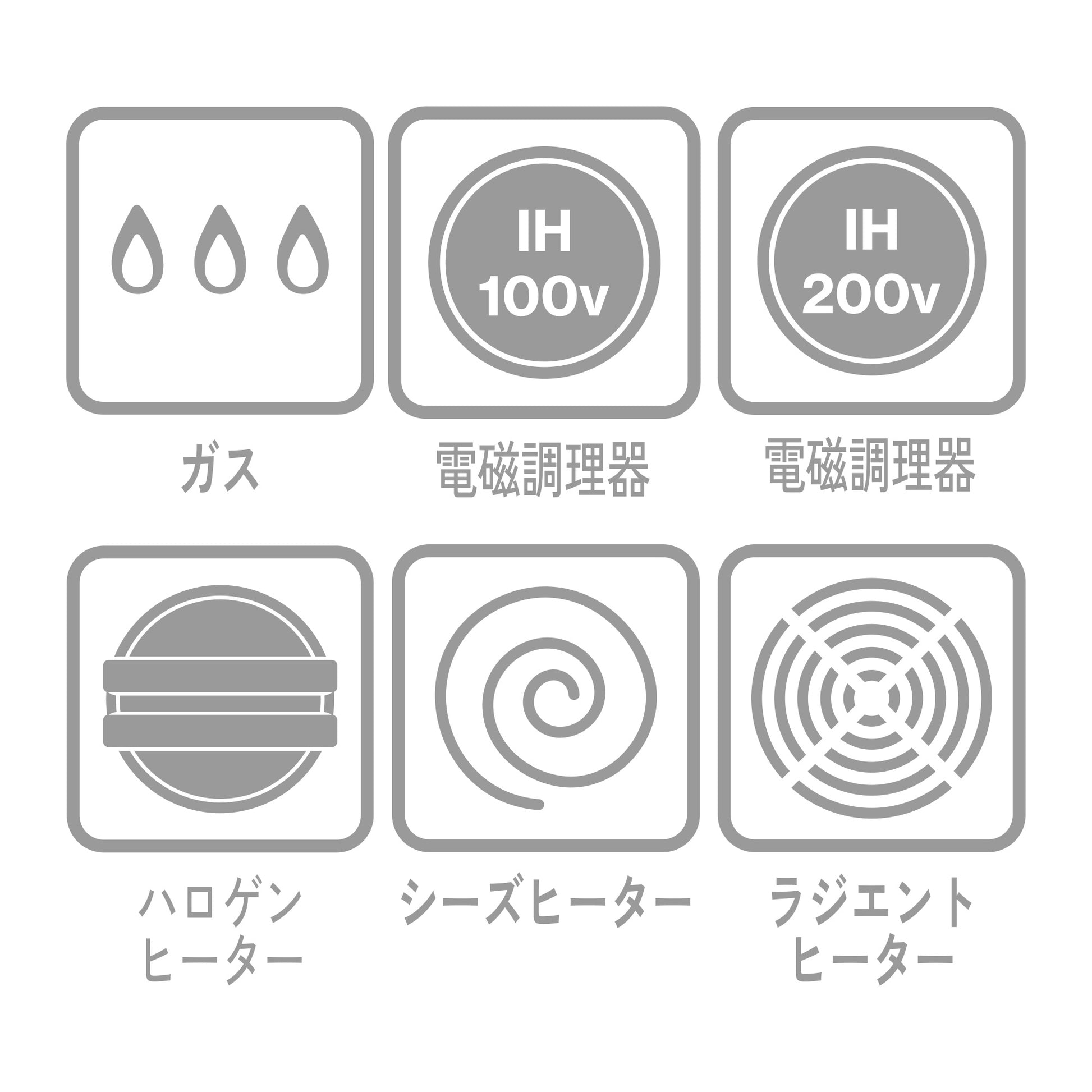 IH(100 V/200 V)にも、ガスコンロなど直火にも対応し、キッチンはもちろんアウトドアや車中泊、キャンプ場などでも活躍します。